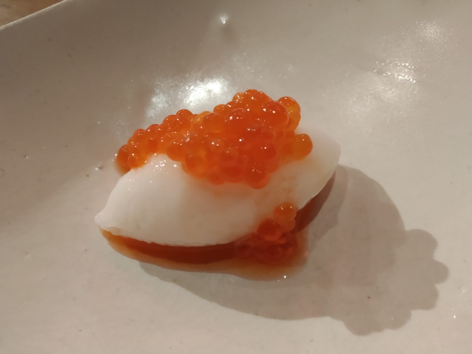 4. Nigiri de sorbete de sushi con huevas frescas de salmón salvaje y nigiri de aceto balsamico ancestral, extra Vecchio, eso es, de 25 años, acompañados con Karakuchi Ginjo Daikissho Tosatsuru. “Un sake seco, muy directo y muy maridable”, tradujo Yutaro Maekawa de Tokyo-Ya. El nombre esconde ‘buena suerte’ en japonés. Suerte la nuestra de probar los dos sutiles, delicados e intensos bocados armonizados.