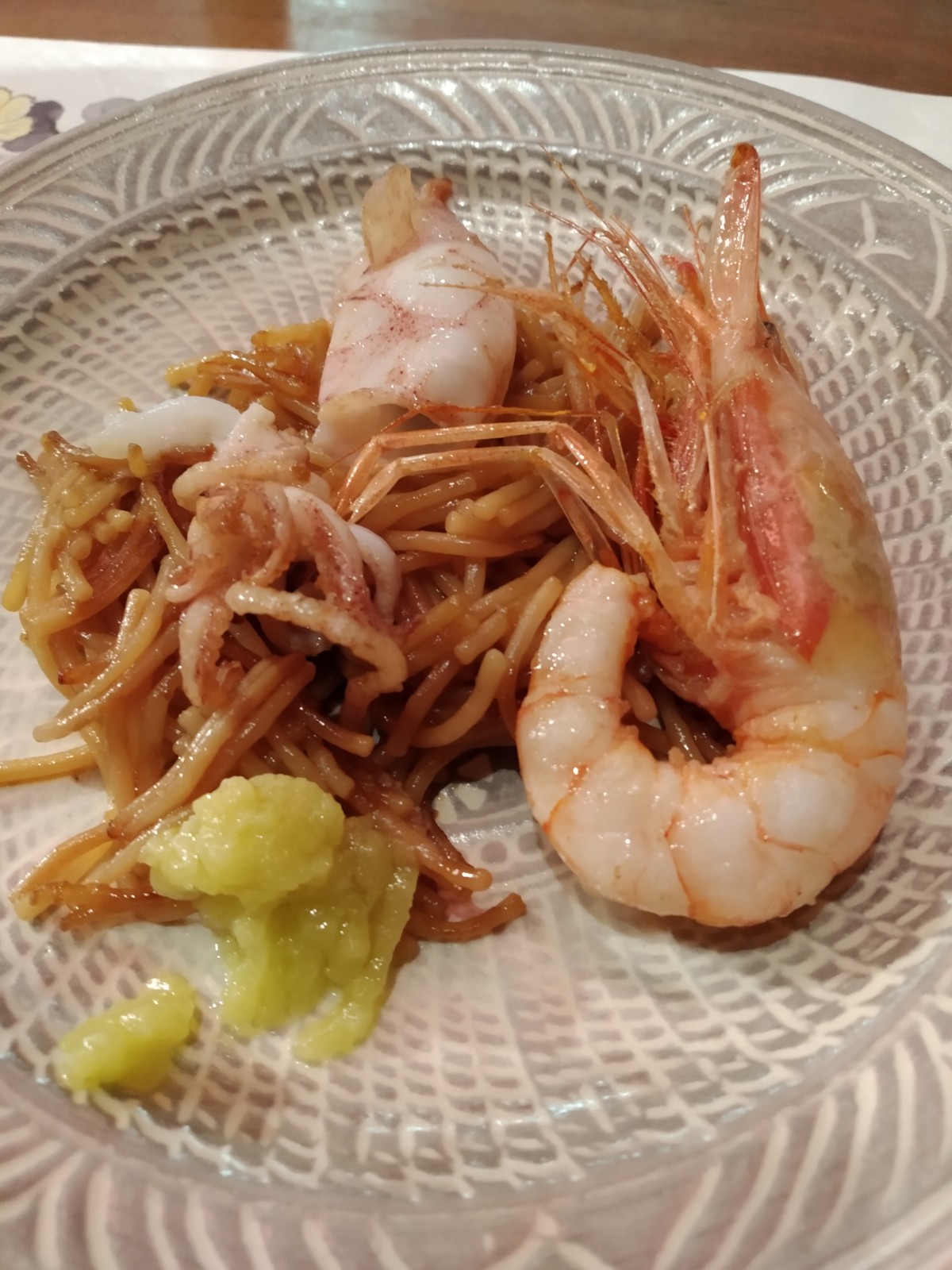 2. La fideuá de Takeshi. Nunca antes se había cocinado ni servido esta receta en esta casa. ¡Qué poderío, Domekawa! ¡Y qué allioli! Un viejo y amado conocido por los comensales del Dos Pebrots, receta de los pescadores de Cadaqués que Borja García reproduce a la perfección en el hermano de Dos Palillos desde su inauguración. ¿El sake? Akitora Junmai; de estilo clásico, con mucho carácter, para entrenados.