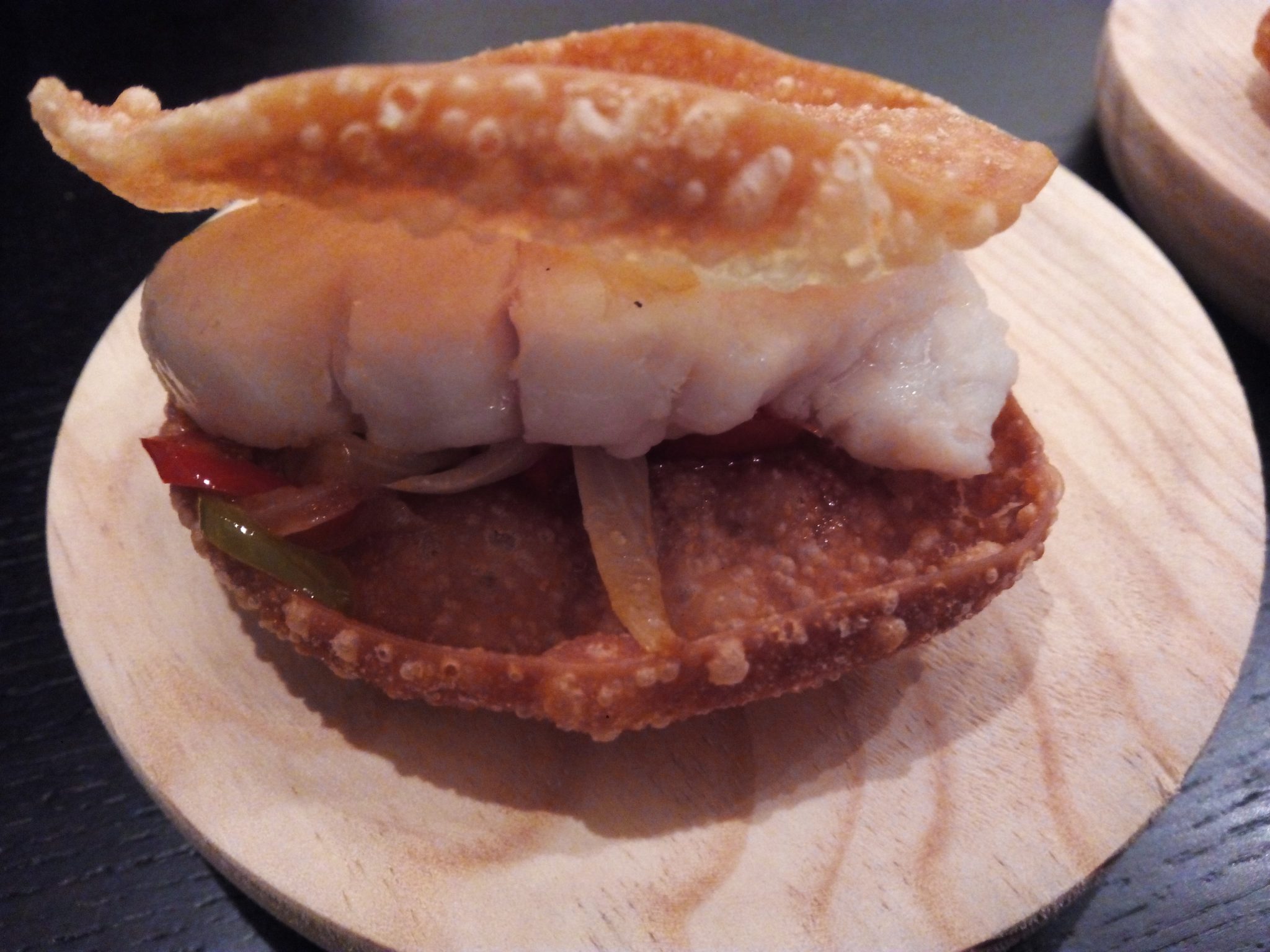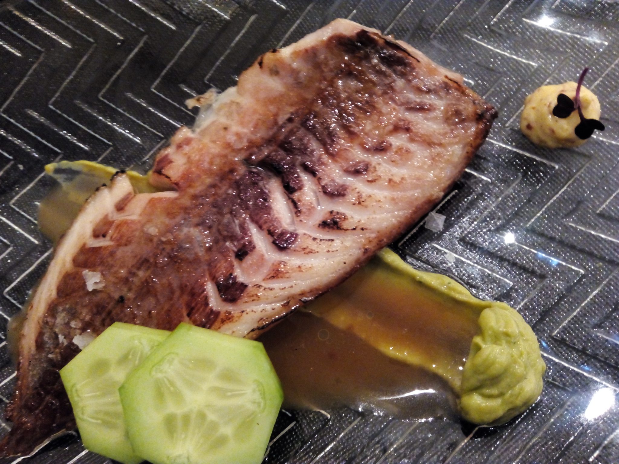 El «primer lance» es su versión del tiradito de sargo hecho al minuto, con aceite y un casi imperceptible toque de lima, porque el objetivo en estos peixes nús (pescados desnudos) es no enmascarar su sabor. «Usamos dos o tres ingredientes como máximo para los pescados», me cuenta. El «segundo lance» es la versión ‘abastos’ de la empanada: dos láminas crujientes entre las que se dispone una merluza impecable con salsa de pimientos, con un resultado ligero y satisfactorio. Continuamos con la «captura del día», para la que el Atlántico quiso obsequiarnos un magnífico jurel, que cocinan bajo la salamandra con su piel y sirven con su propio jugo, aguacate y mostaza. No le hace falta más.