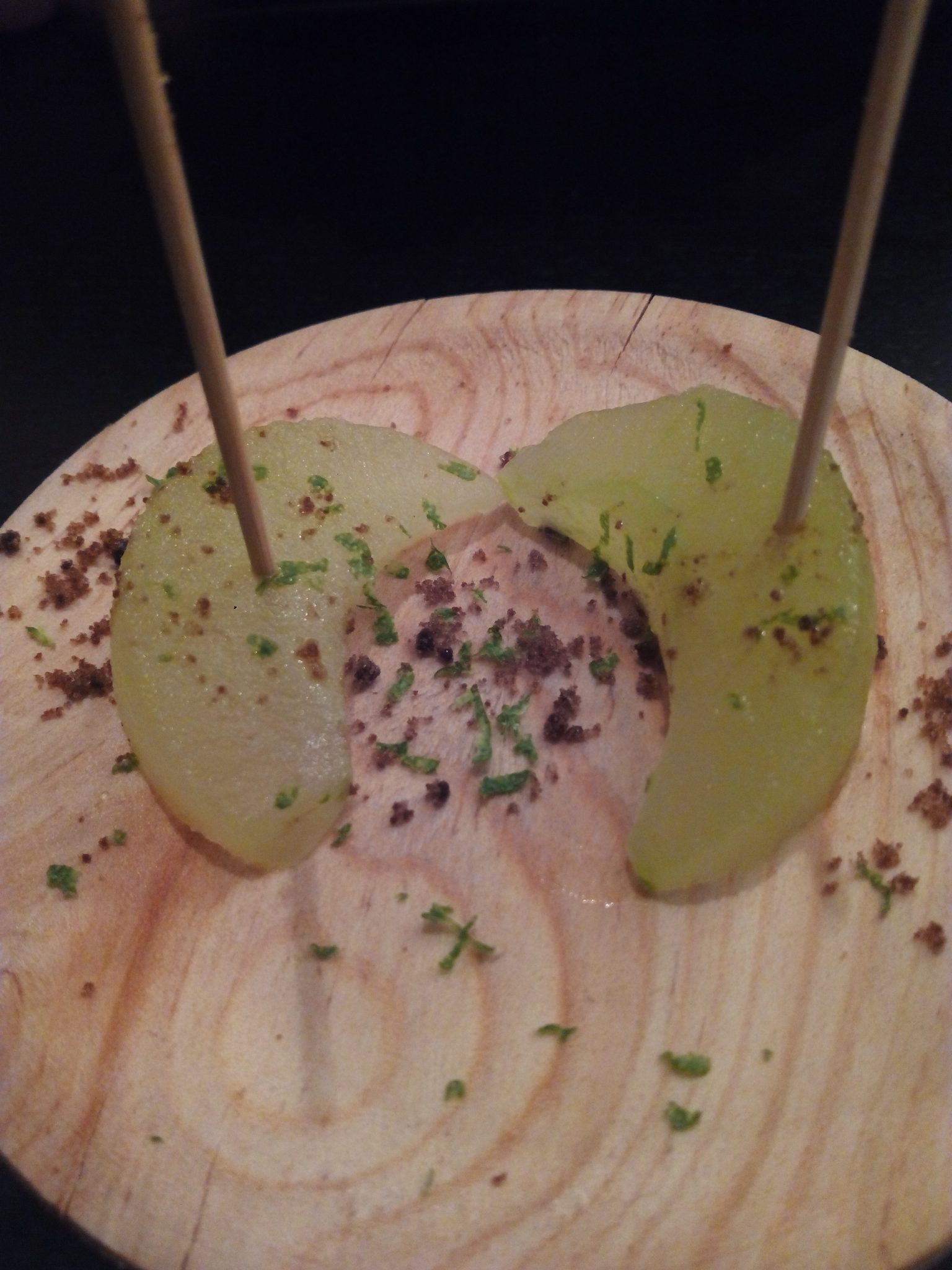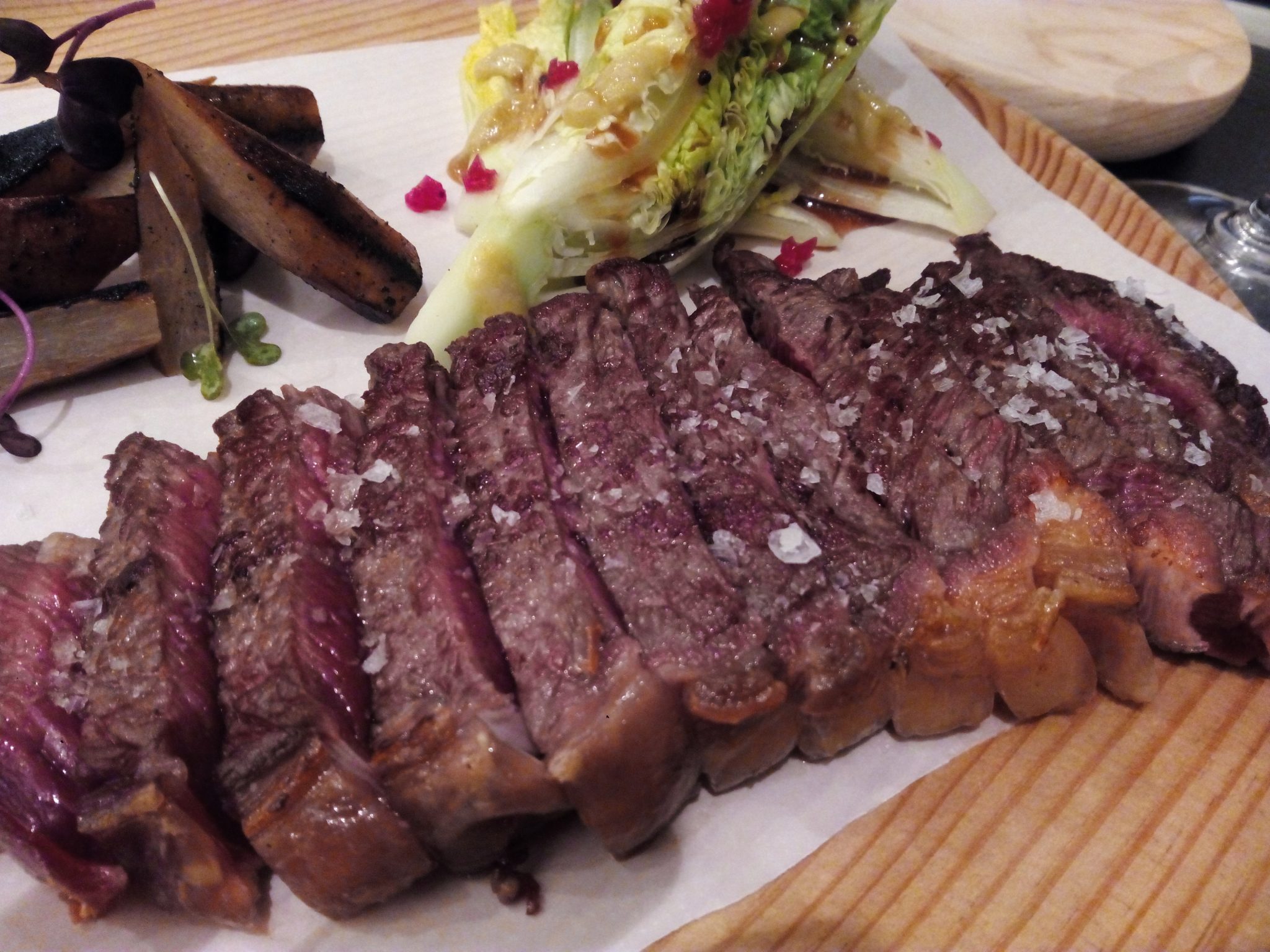 Para completar el menú hay opciones como el pulpo by Abastos, el huevo con patata chorizo y pan -los probé en la taberna Abastos 2.0 recientemente y los recomiendo- y el entrecot de vaca vieja, acompañado de cogollos aliñados y salsifí asado, por el que opté esta vez; igual que en los productos marinos, calidad y buen trato de la materia prima. Como postre del menú, una rodaja de manzana macerada que agrada sin más, aunque en la carta incluyen algunas propuestas como las cañitas y la tarta de Santiago. Cuentan con una buena selección de vinos gallegos blancos y tintos, que también se pueden tomar por copas, vermús de su tierra y aguardientes de la misma procedencia, algunos cócteles y el ya indispensable gintonic.