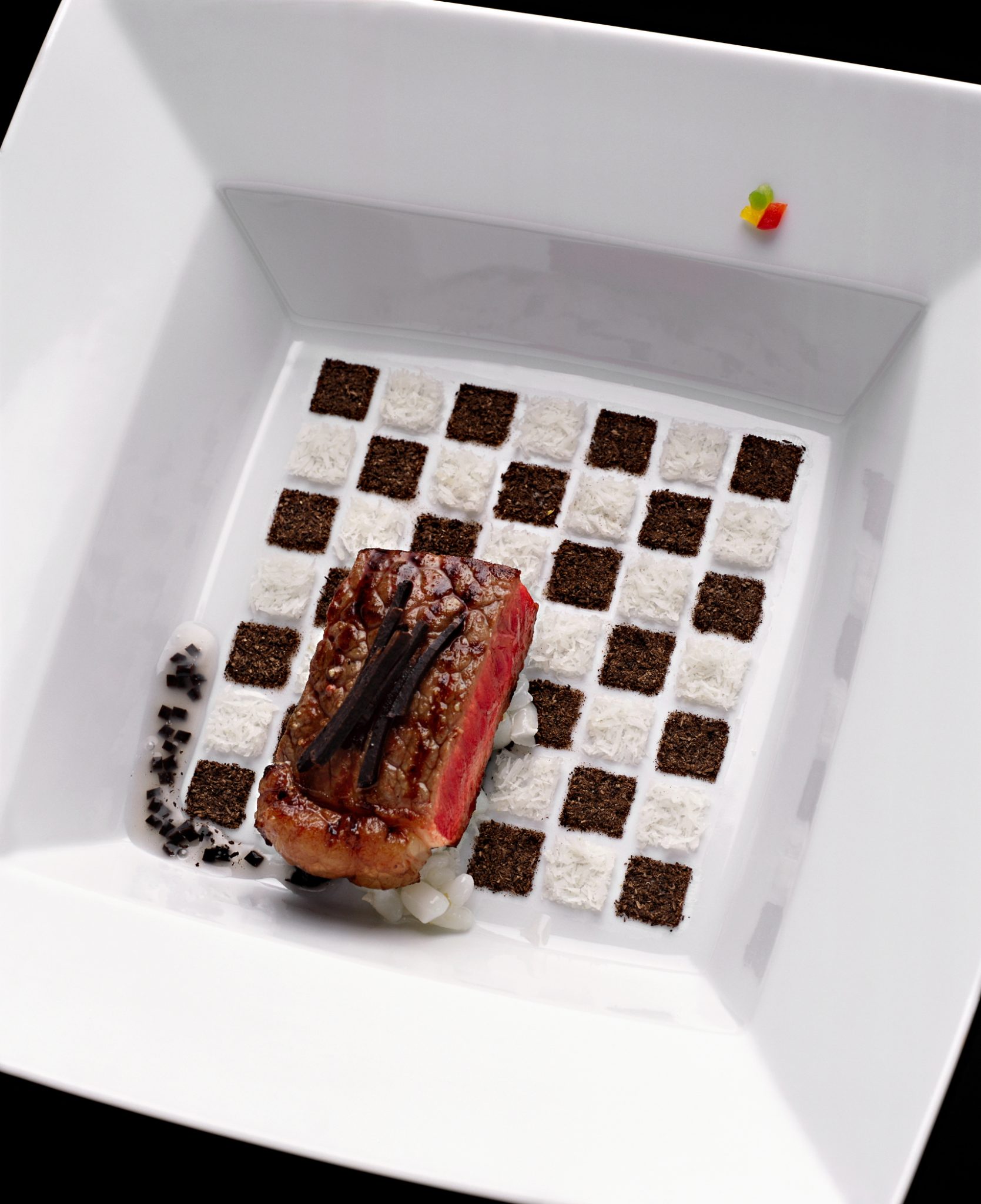 Atún rojo, lámina de chocolate blanco y ovillos de verduras y setas (Copyright: Oliver Brenneisen)