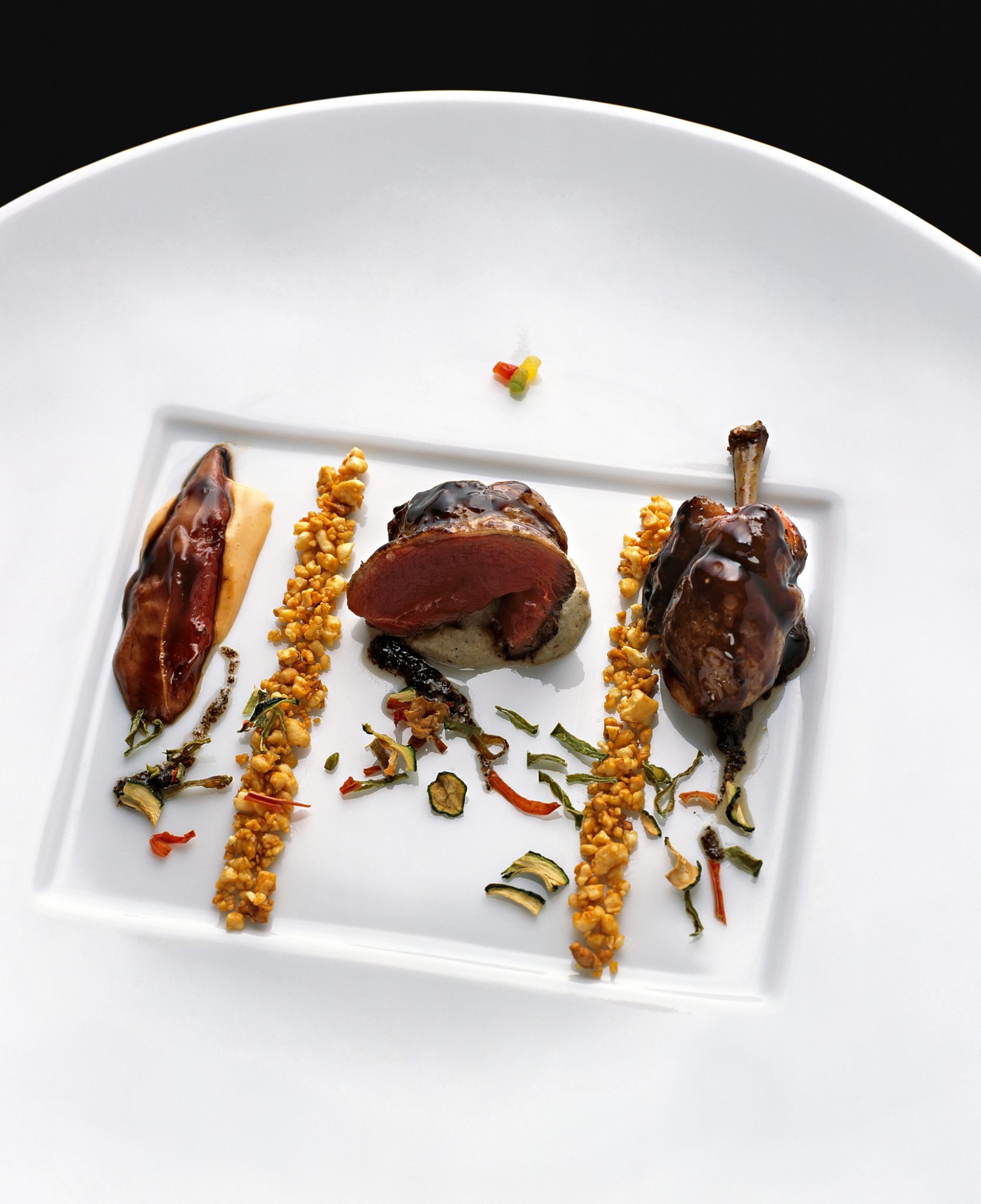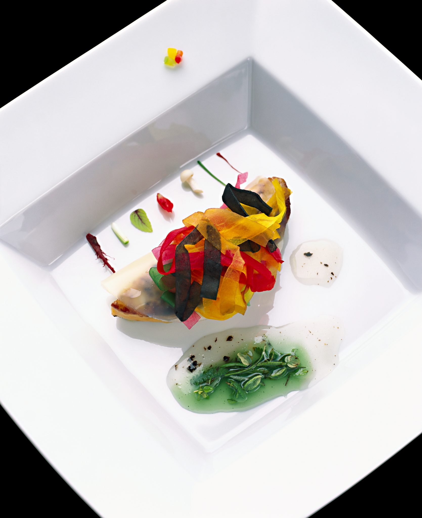 Me quedan de aquellos años recuerdos que jamás podré extraer de mi disco duro. Platos como la crema de agua marina con corazón de puerros y ventresca de salmón salvaje ahumado; el culto y sofisticado crujiente de ostra con caldo corto de azafrán y semi-confit frío de mariscos con concha; la sardina en garum de mejillones y muselina de pulpa de tomate con cristalinos de Micri film (producto espesante que desarrolló y que fue la fuente de sus polémicas con otros chefs); el “blend” escogido de ocho minivariedades de setas con emulsión de aceite de oliva arbequina y berenjena a la llama de morera; el “ómnium” de cereales con aceite de oliva virgen picual y salsa aterciopelada de tandoori, oliva negra y trufa negra (éste fue uno de los platos más espectaculares del menú del construccionismo: ¿cómo sacarle partido a algo tan árido como los cereales? Dándoles jugosidad y recreando una confusión en el plato cuya resultante era un sabor lleno, rico, suculento y, desde luego, sorprendente); el lomo de bacalao confitado en aceite de oliva hojiblanca, napado en velouté de huevas de bacalao y puré de tomate glaseado; el pichón con garbanzos negros, caldo de verduras, foie gras, cardamomo, café, frutos secos, canela (alquímico); o el chocogel de cacao criollo de Venezuela con menta, tandoori, coco, naranja, rosa, café con leche y base de gelatina nacarada (seis cilindros de inquietante presencia -alucinante la base de nácar, elaborada con minerales- que conformaban un espectáculo tanto visual como gustativo).