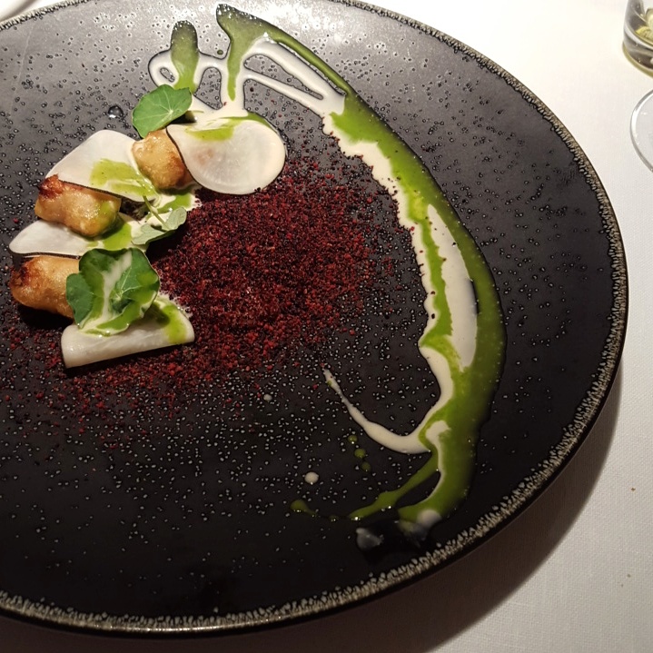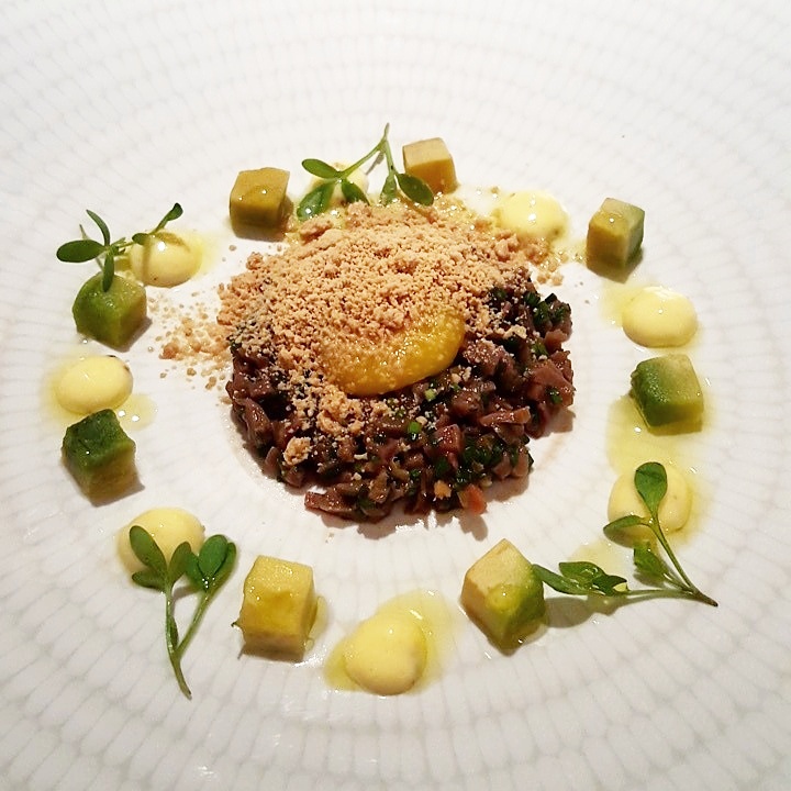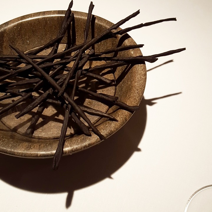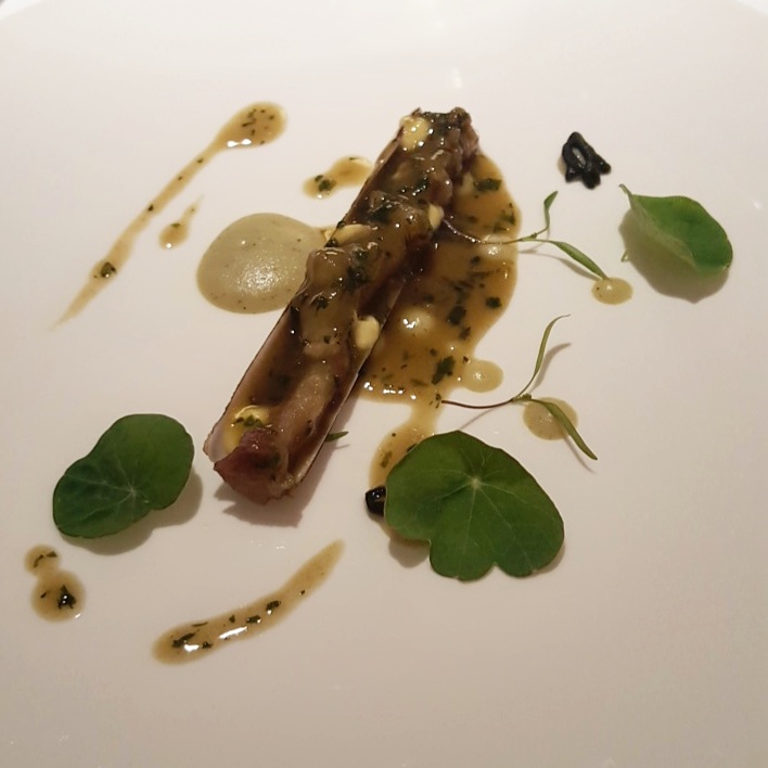 Y miramos hacia el valle, como reza la carta. Una primera parte que late con el tartar de corazones, polvo helado de foie-gras, aguacate y mostaza; tan potente y categórico como sutil en su emplatado. Los sesos lacados, emulando a un hígado de pato, a partir de unos sesos de cordero, enmudecen la mesa caníbal con su textura deslumbrante y sorprendente, hay quien no paró de mover la cabeza con incredulidad y quien sonrió con sus ligeros brillos cítricos y avinagrados. Proseguimos con…¿unas navajas? no, unos tendones de cerdo que parecen navajas, el espíritu del discurso de Ángel León bordado con materia cárnica. Llegan las lechecillas de cordero con coliflor y encurtidos y el emplatado es casi de belleza hiriente, colosal, abstracta, con una fuerza que también se descubre con cada mordisco, con una acidez provocativa pero una envolvencia seductora en boca.