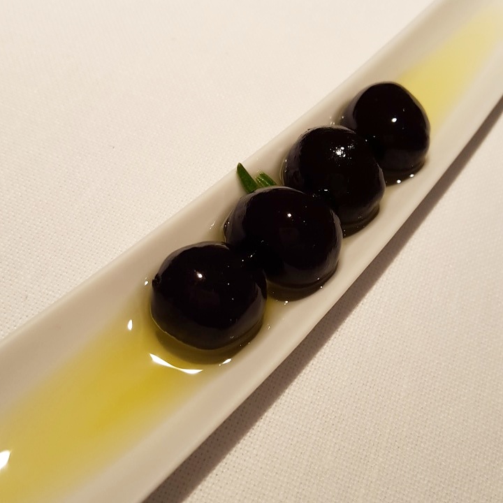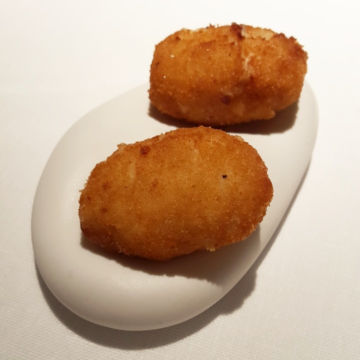 Los sarmientos de queso abren el banquete, trampantojos que emulan a los manojos de cañas y hierbas que serán brasa algún día. Siguen las aceitunas negras, esferificaciones de anchoa, aceite, queso y pimiento rojo; aperitivo explosivo que rinde honores a una célebre tapa de la calle Laurel. Y cómo no, las croquetas, apellidadas con una subordinada de tributo: «que le quitamos a mi madre».