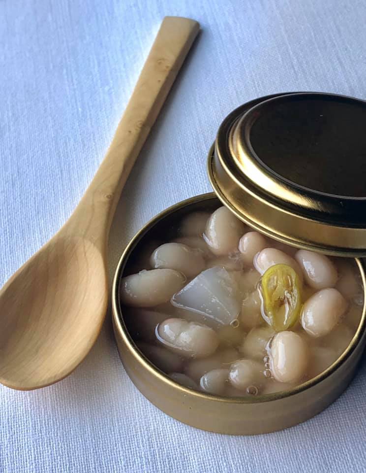 El caviar de La Garrotxa: judías de Santa Pau –d.o.p.-, pimiento confitado, tocino vegetal