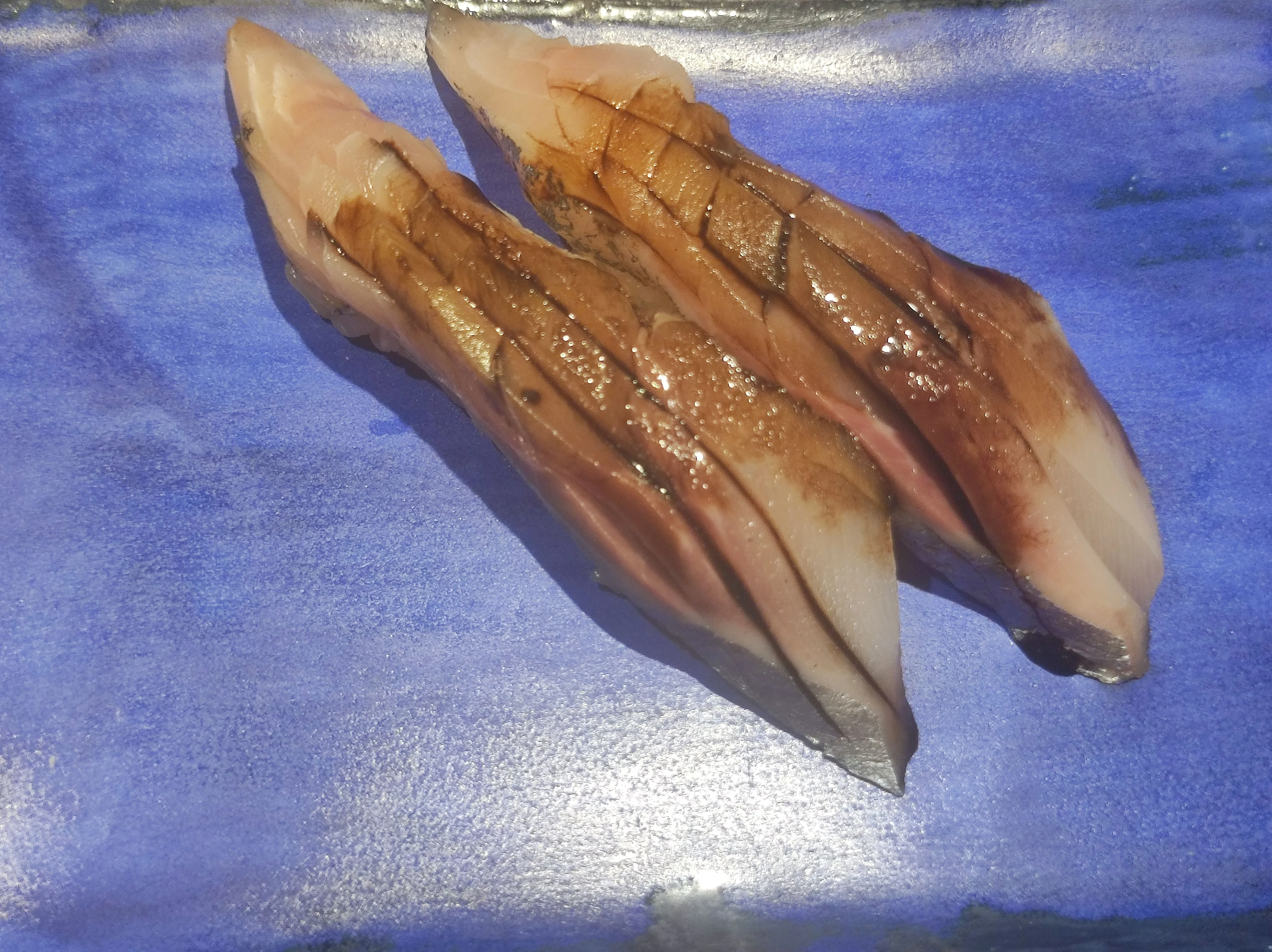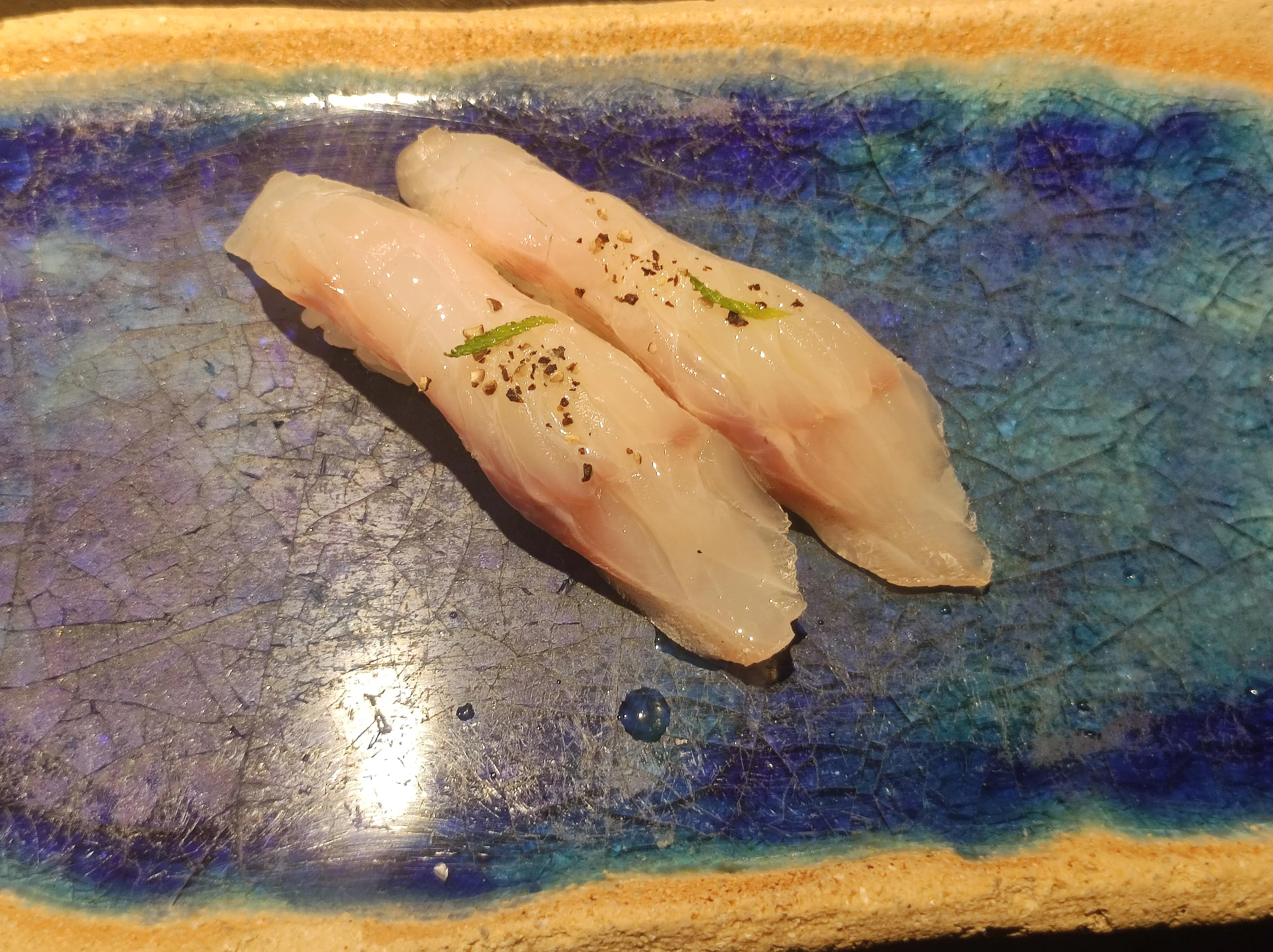Llega el momento de los nigiris, en los que la gran estrella es el impecable arroz, tanto por cocción como por cantidad en cada pieza. ¿Por qué en muchos japoneses nuevos y, sobre todo, fashion piensan que poner menos arroz es mejor, cuando es un error porque se pierde el equilibrio?. Lubina con cinco días de maduración, pimienta y lima: intensidad y frescura. Espardeña al pilpil de su jugo, potencia y profundidad. Socarrat de paella con gamba blanca: un histórico de la casa en magnífico homenaje a un plato mítico de Alberto Chicote en No-do. Chicharro ahumado con harissa: reminiscencias magrebíes. Kokotxayaki: divertido (y mejorado) guiño al takoyaki de Osaka.