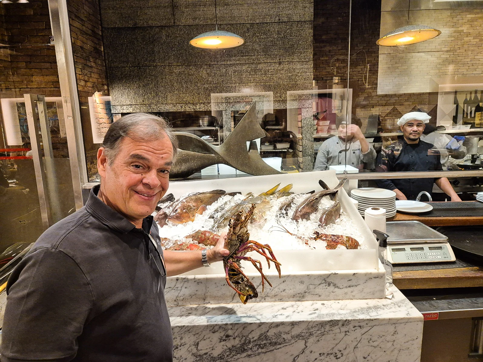 No es hombre que se corte, Marcelo. Con sólo ver el puesto de grandes pescados y mariscos que exhibe en el comedor, se advierte que en Giuseppe Grill no se juega. “Todos nuestros pescados y mariscos son de las costas de Río de Janeiro, y en su gran mayoría, pescados con arpón. Yo mismo, todos los jueves, salgo a la mar con mi fusil submarino a pescar”. Lo dicho. Por no hablar de su gran bodega acristalada (premiada por Wine Spectator), casi 700 referencias donde no falta ‘lo máximo’.