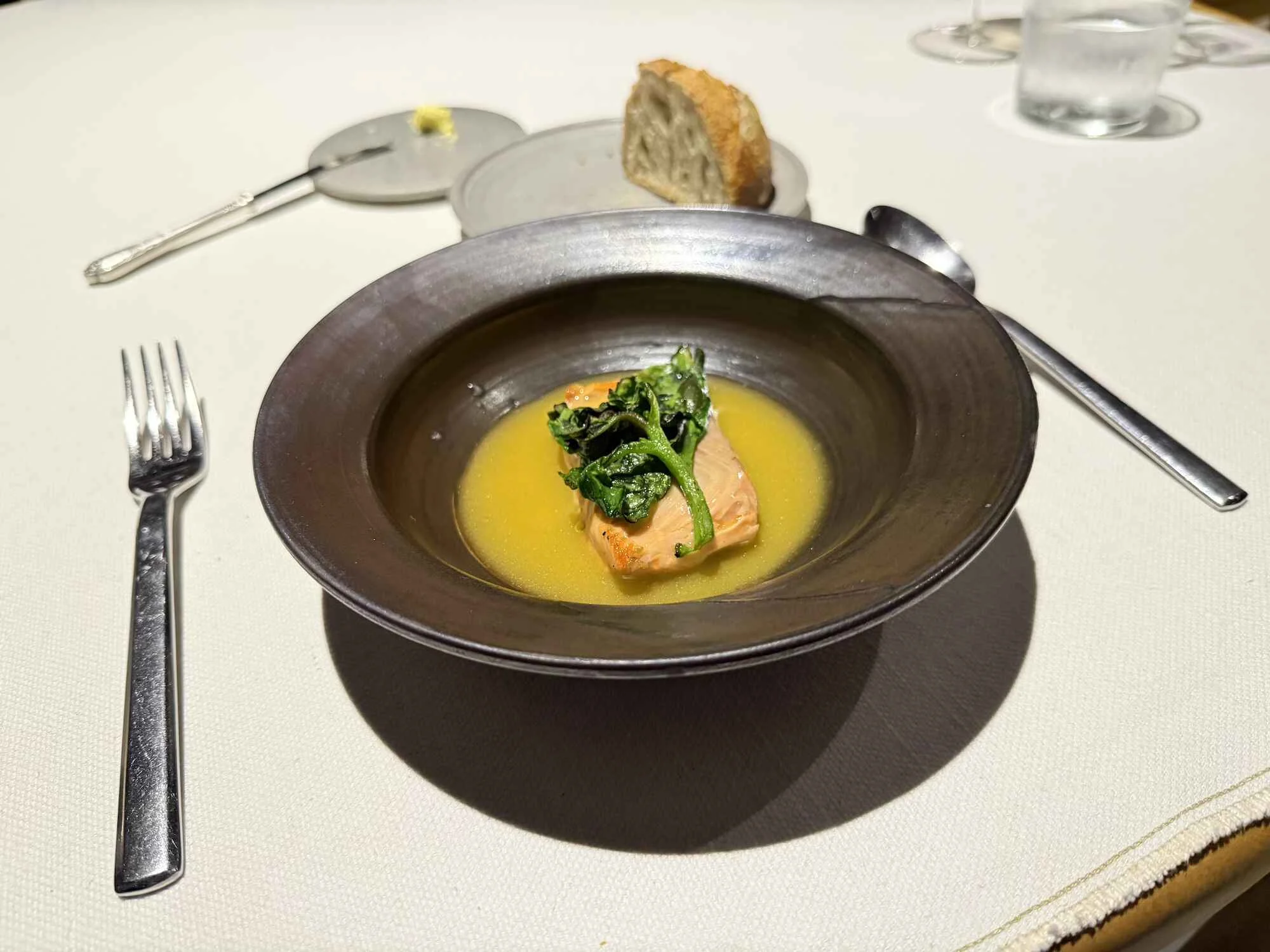 Volviendo a la mesa de Gesto, la terneza e infiltración de sus carnes se evidencia bien en el primer paso del menú, su charcutería: cullatelo, papada, salami y chips de pan de masa madre. El lugar es el escenario ideal para el servicio. Trucha ahumada y brevo llegaron a continuación. Acompaña una pequeña hogaza, también elaborada en casa y mantequilla. Desde la época de Barcal, su anterior restaurante, Miguel le apuesta al producto de cercanía. Lo que aún no producen en su finca, lo adquieren a productores cercanos. No hay productos de mar, ubicado a más de 300 kilómetros de Medellín en la región del Urabá. El pescado de agua dulce repite, en este caso a la brasa y con espinacas.