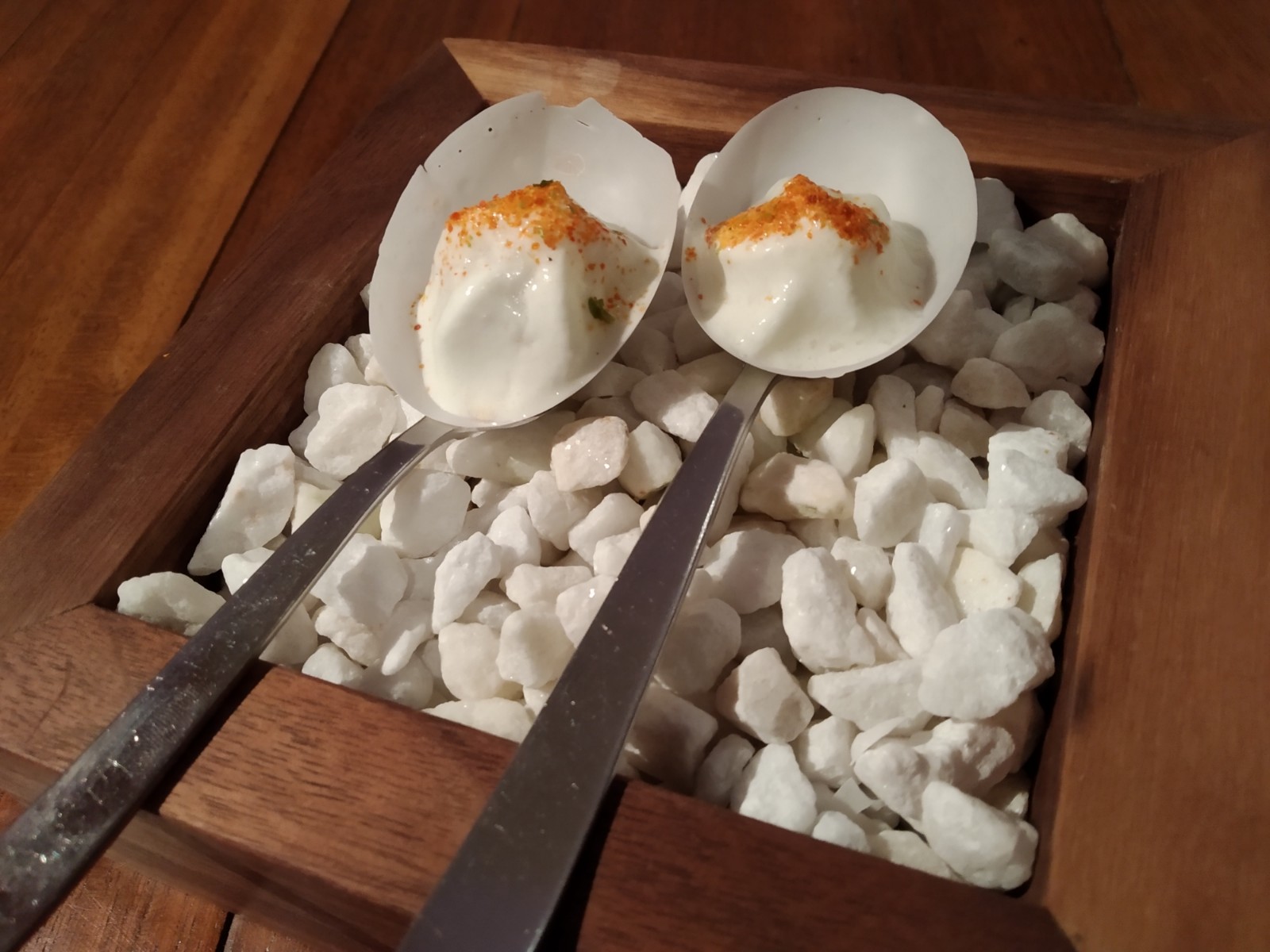 La cena de inauguración empezó con cuatro aperitivos “para abrir boca” servidos en una mesa alta al inicio del local donde Molina atiende directamente, en este 4 manos y en todos los servicios. El sábado fueron huevo de pepino, jengibre y shichimi; mocktail de arándanos y té de jazmín especiado; crujiente de tapioca, remolacha y citrus, y bocado de arroz salvaje, maíz y caviar. Shichimi, jengibre, té. Los ojos no se achinaban del todo, pero empezaban a mirar con suspicacia.