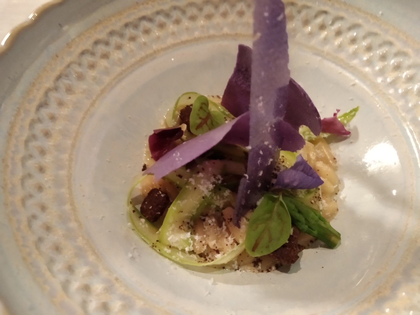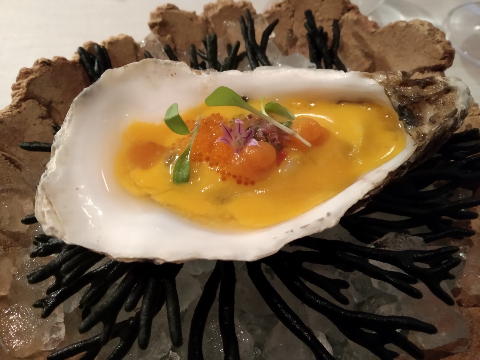 En ese viaje aparecía el chef de Coque** para reclamar centralidad. Esencia de carabinero a la parrilla con gelée del propio colágeno, donde el cuerpo crudo solo un poco caliente se complementaba con el jugo de la cabeza. Y, previo al falso risotto de piñones sin arroz pero con trigueros y polvo de café, parpatana de atún toro. Uno de los best sellers del madrileño llegaba ampliado con la médula del atún confitada en caldo dashi, sashimi con vinagreta de la piparra y guiso de tamarillo para acabar con su parapatana glaseada. El mundo del atún según Sandoval cerraba los principales.
