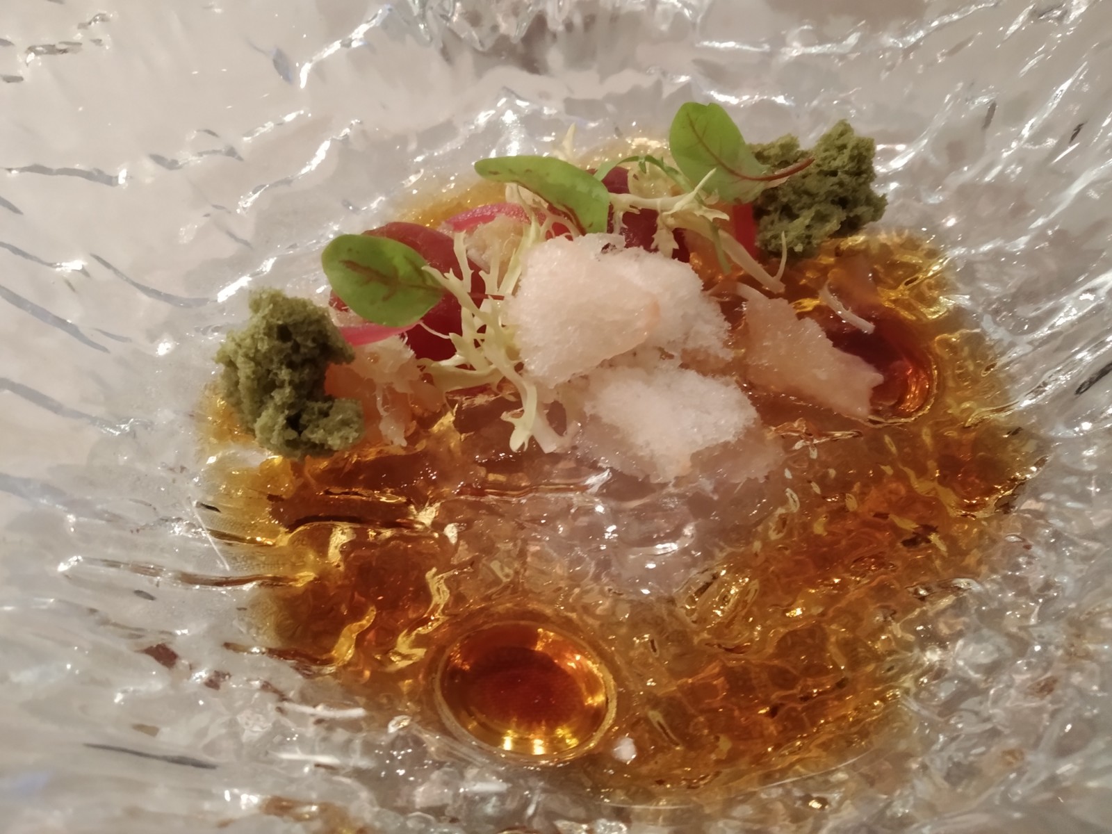 Ostra Amelie acevichada con huevas de pez volador, camote y ají. Misha y Acurio saludaban. El Mediterráneo y la tradición evolucionada aparecían mediante una ensalada de “crostes”, un plato tradicional de la isla con “peix sec” en La Gaia recreada con té matcha y tomates encurtidos en dashi. Volvíamos y nos íbamos.