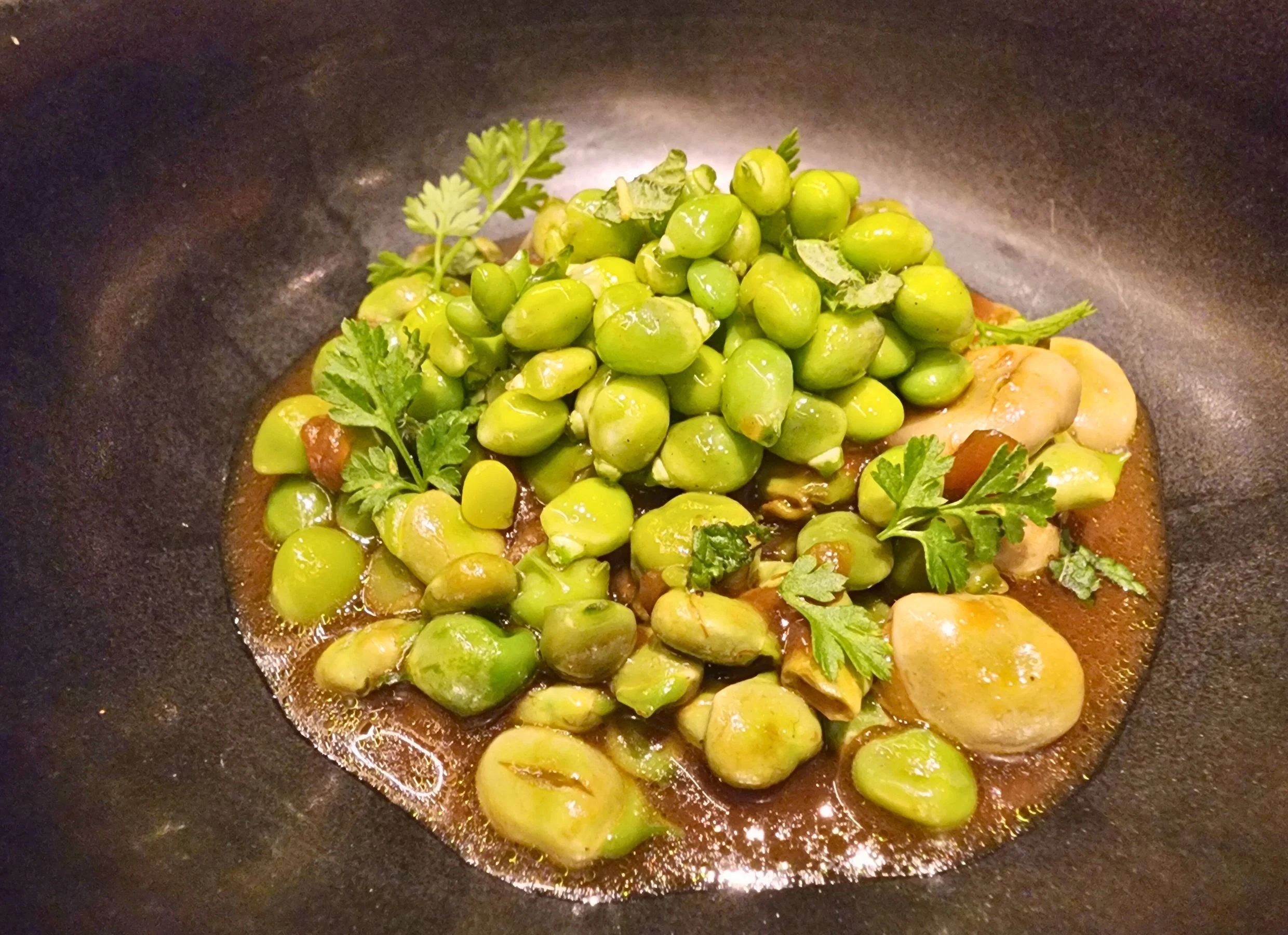 Taxonomía de texturas y estallidos los guisantes (lágrima, pequeños y medianos) y las habitas ‘ofegats’ (cocinados parsimoniosamente y usando su propio líquido). Y, no por conocida en el Aürt, es menos la lúbrica molleja a la brasa lenta con ensalada de achicoria, sin más, sin menos.